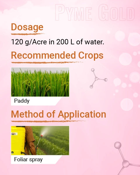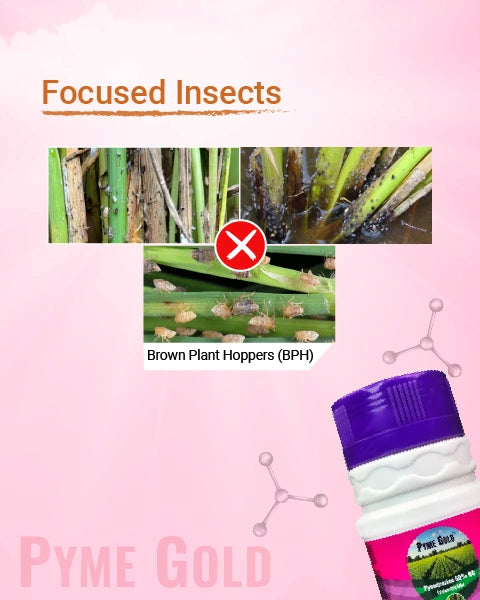 Mode of Action: Pyme Gold disrupts the nervous system of piercing-sucking pests like brown plant hoppers, leading to immediate and irreversible paralysis of their mouthparts and hind legs. As a result, the pests are unable to feed, withdraw from feeding activity, and are prevented from laying further eggs. This rapid action causes starvation and ultimately leads to the death of the insect, offering effective and long-lasting crop protection.